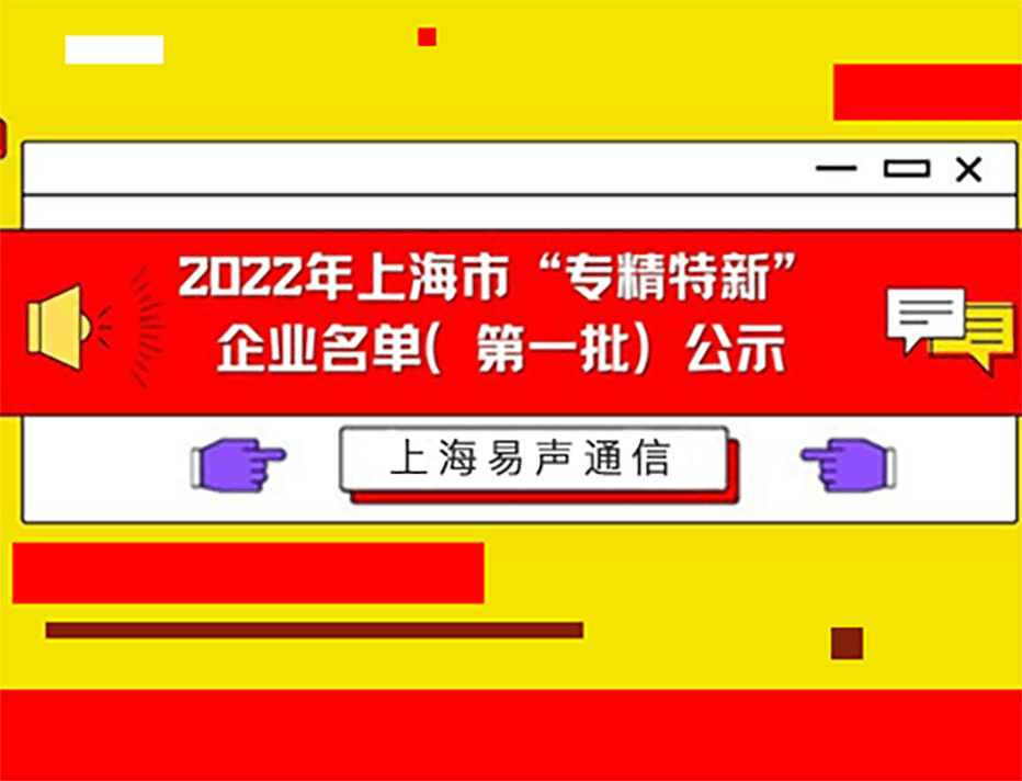 近日,根据《上海市经济信息化委关于组织推荐2021年度"专精特新"企业的通知》(沪经信企〔2021〕539号,经专家评审和综合评估,上海易声通信发展有限公司(以下简称:上海易声)凭借在技术创新发展方面的优异成绩,顺利入选2022年度上海市"专精特新"企业名录(第一批)。